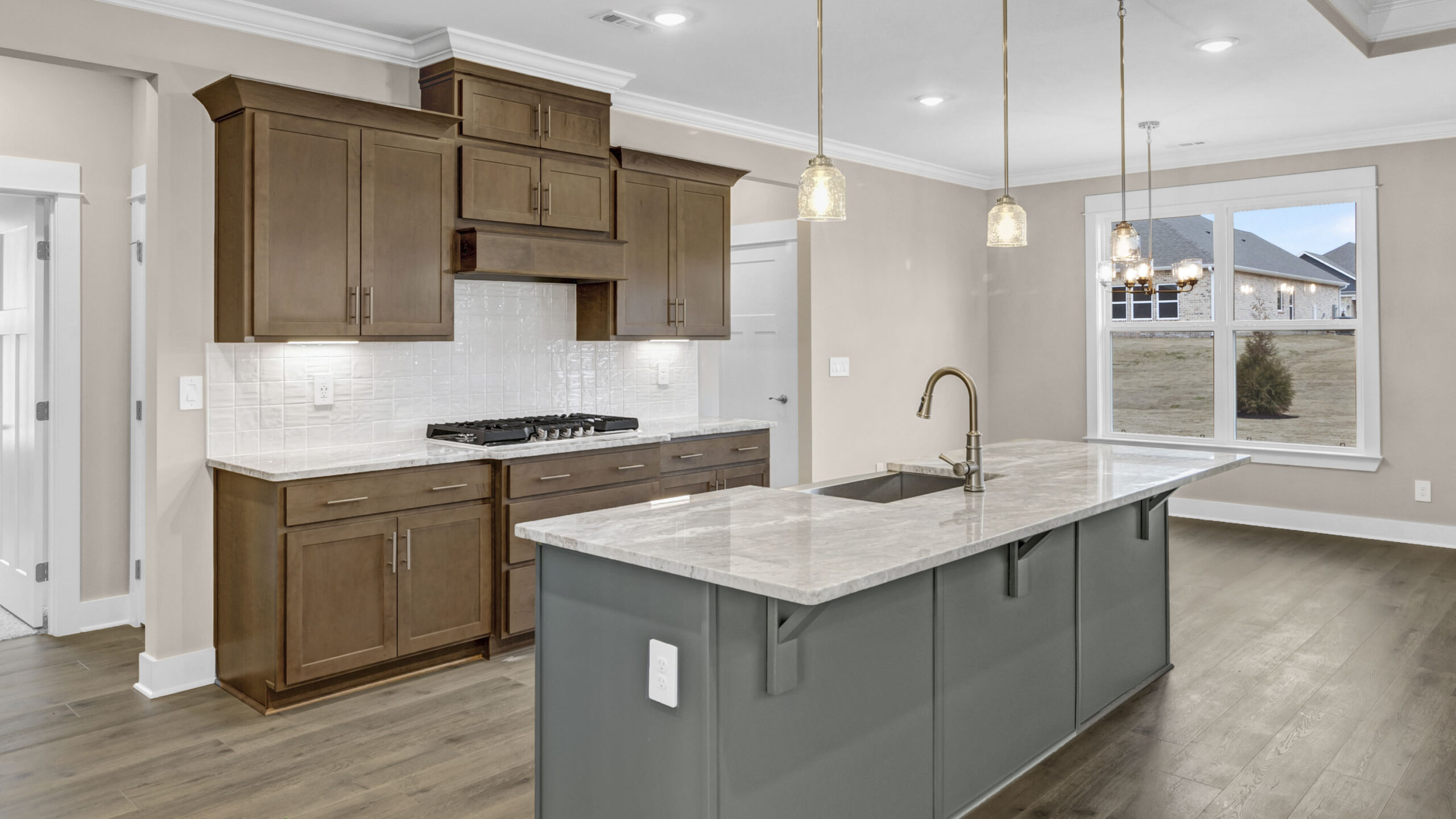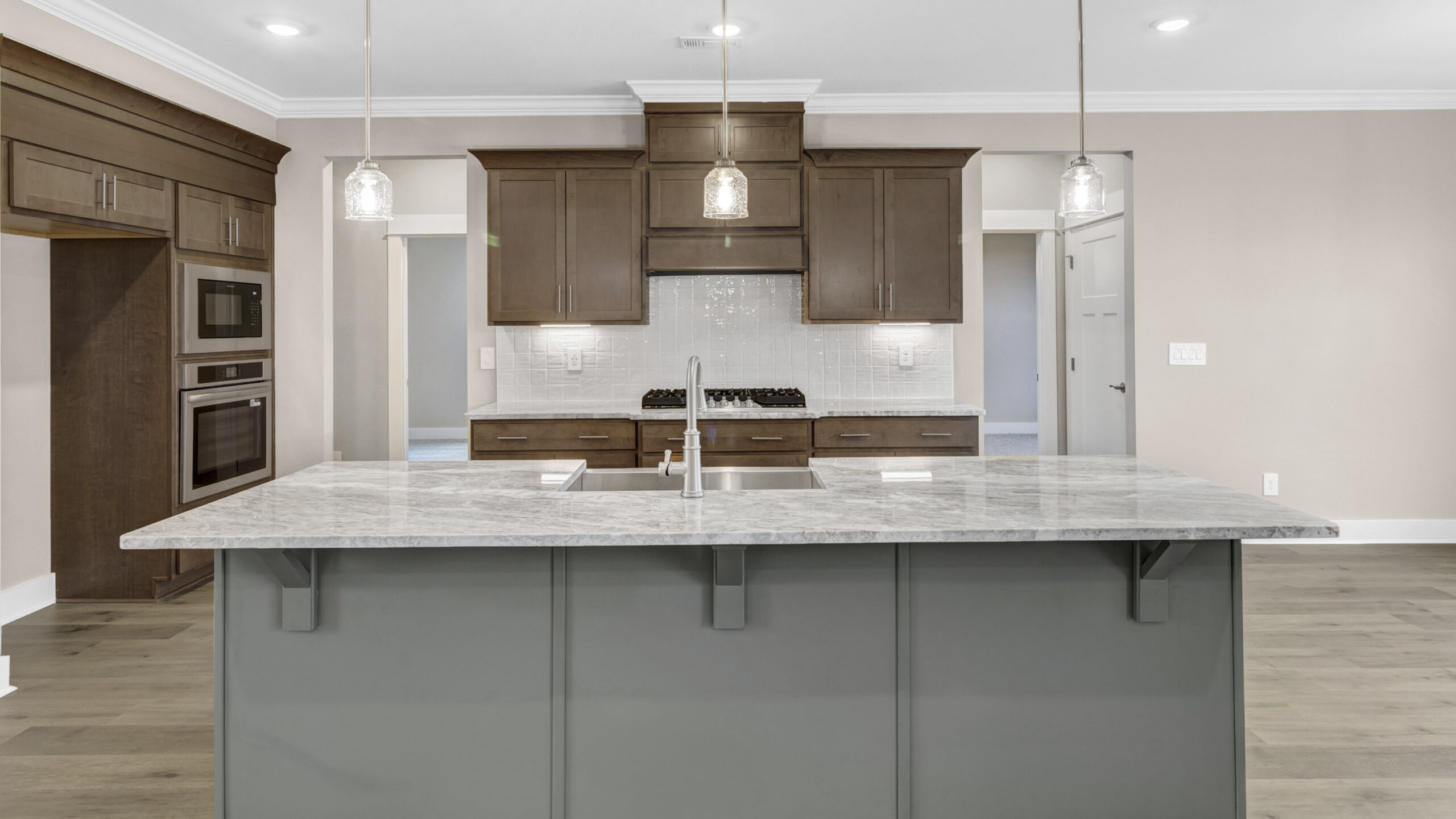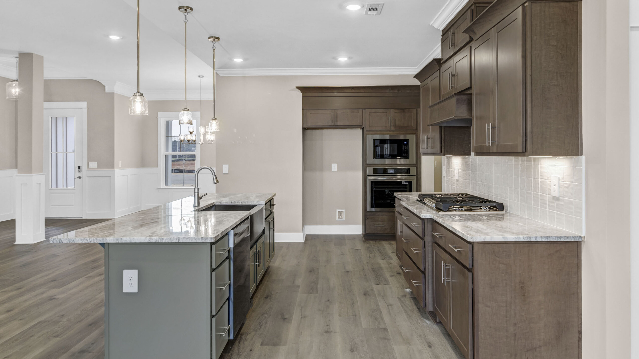 A space for every imaginable use, this home exudes luxury and comfort. Enter through the heavy-wood door into the foyer. The open layout allows the formal dining room to open to great room area and continuously flow into the chef’s kitchen. The gourmet kitchen boasts beautiful painted cabinetry, gorgeous granite counters, a large work island, gas cooktop, stainless steel dishwasher, and built-in wall mounted oven and microwave.