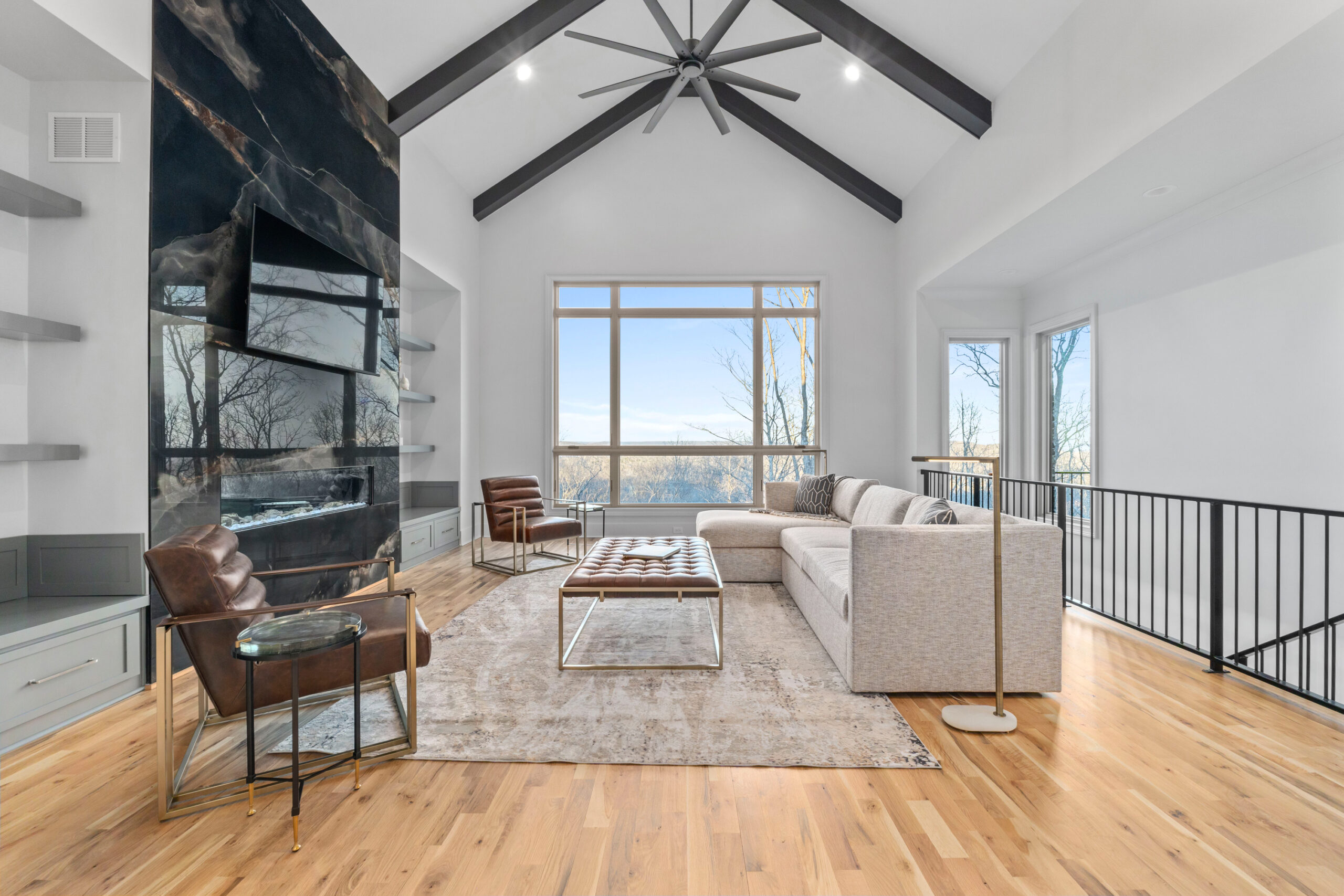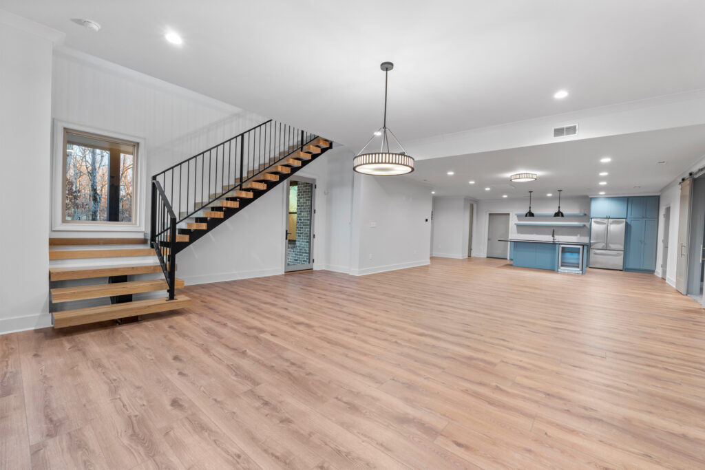 Walking down the floating stairs to the basement you immediately see the contemporary electric fireplace surround. The basement was thoughtfully designed to include a large entertainment area, Kitchenette, Media Room, Powder Bath, Safe Room, Bedroom with a Full Bath, and a large unfinished storage room.