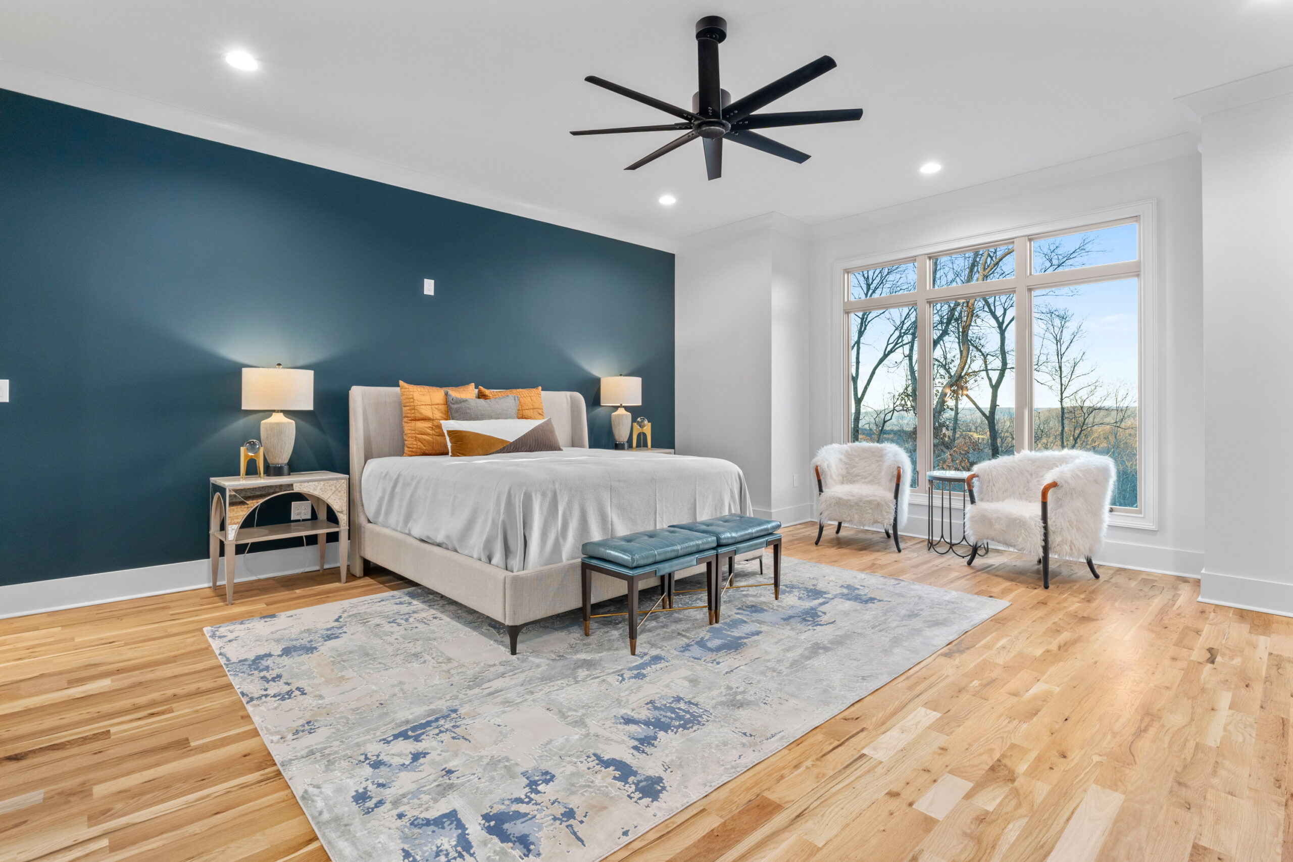 This amazing home exhibits contemporary touches with its lighting, floating stairs, and fireplace surrounds.